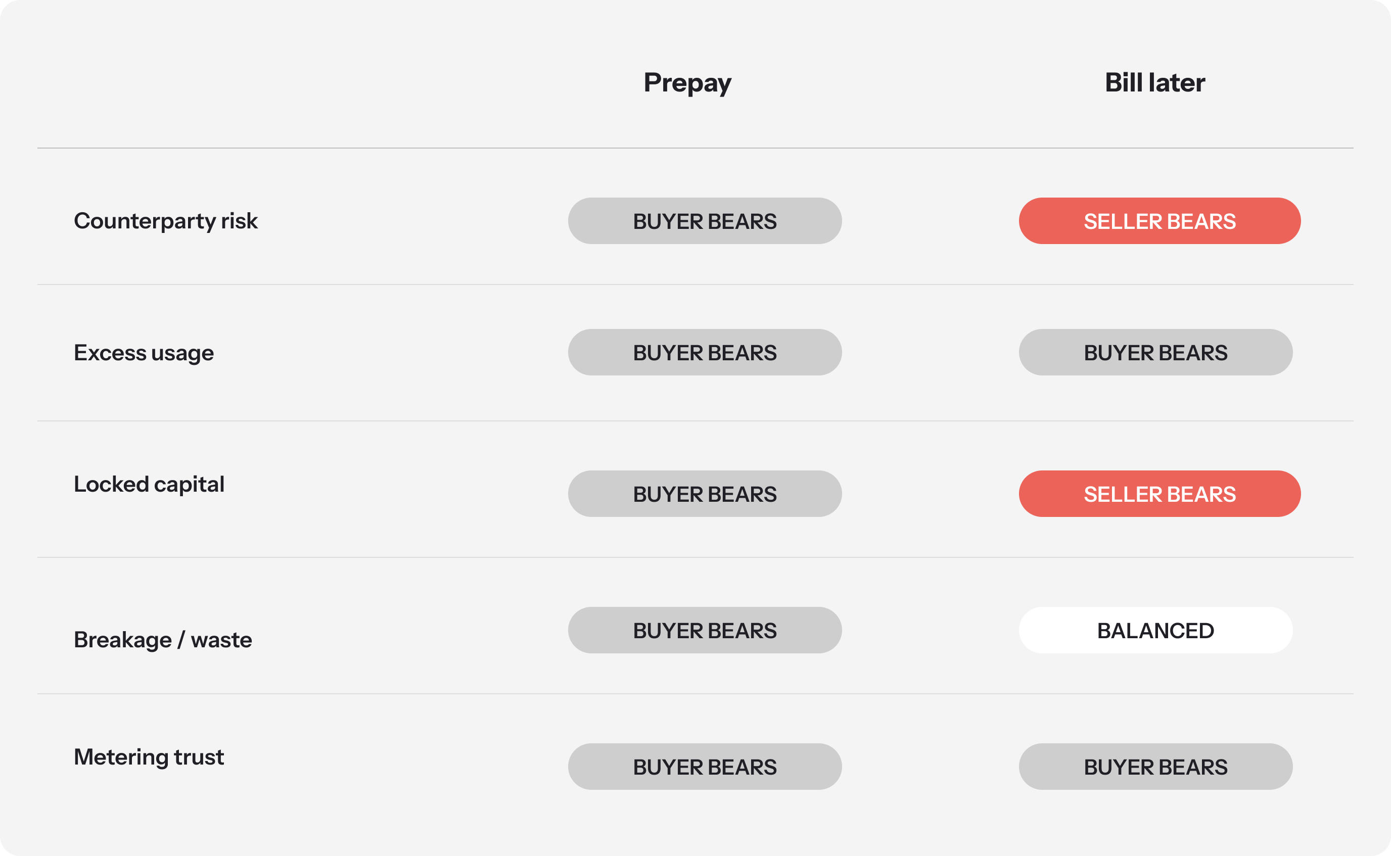 Typically, usage-based-billing takes one of two forms: pay up front through pre-purchased credits, or pay later when the provider bills you for your monthly usage. These arrangements are solving for a few factors, with risk and value accruing unevenly across the buyer and the seller.